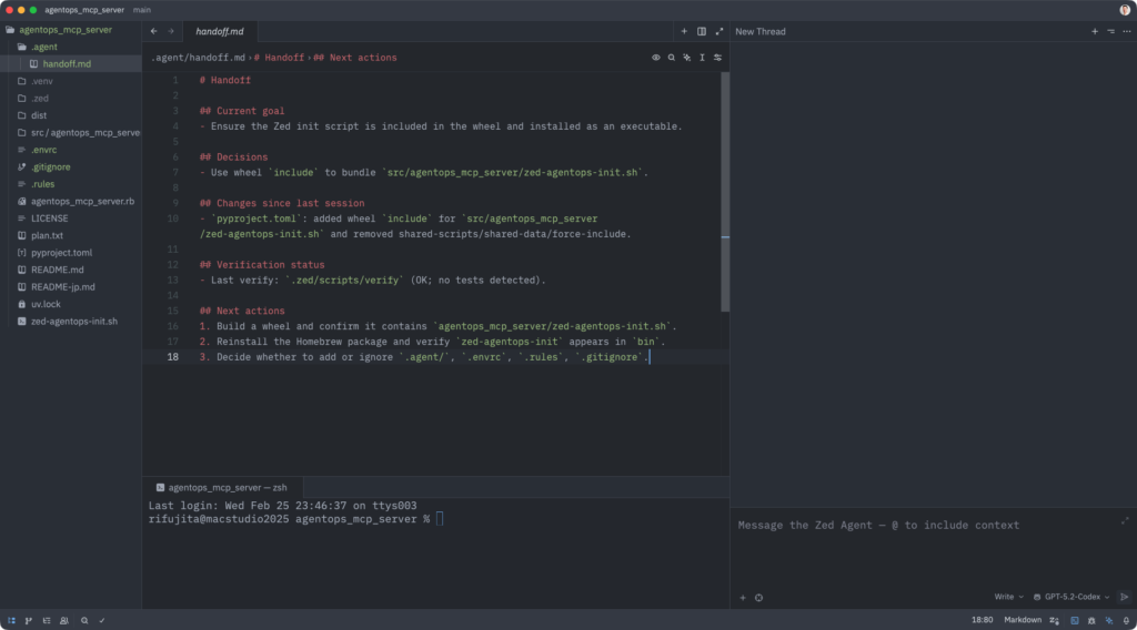 コンテキストウインドウがリミットいって、新しいセッション(スレッド)を開くと、.agent/handoff.md .agent/journal.jsonl, checkpoint.json, snapshot.jsonを自動的に読み込みます。Zedは前スレを要約して受け渡すはずなんだけど、現状、エラー出まくりでダメです。