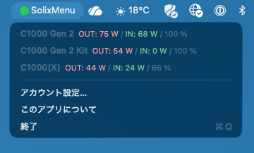 で、agentops_mcp_serverを書いた結果、ZedでのAIエージェントの利用効率が劇的に改善したので、Pythonの非公式ライブラリを参考にSwiftでSolixMenu.appというアプリを書かせてみた。メニューバーに表示するだけで、バッテリーの設定を変更するような機能は一切無い、シンプルなアプリ。