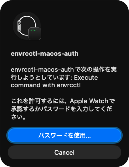 envrcctlでexecするとmacOSではダイアログが出るので、Apple Watchで承認する、と。