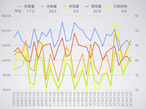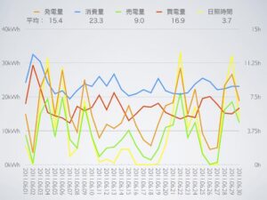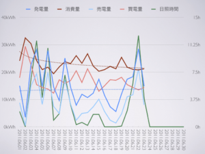データを入力してみた。日照時間が0でも、つまり1日雨でも全く発電しないわけではないけれど、発電量が消費量を上回る、つまり自給率100%を超えるには、日照時間が7時間強ぐらい無いと厳しいことが分かった。後はもっと節電かなぁ […]