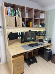 買ったまま納戸に置いてあった24mm厚の板にサンダーかけてアクリル塗装して400番かけて、M4鬼目でモノタロウで買った脚を付けただけだけど、娘ちゃんも穴開けとかやったので「自分の机」です。 白黒どっちにするかちょっと迷っ […]