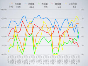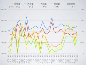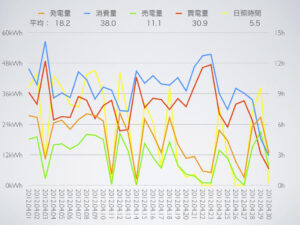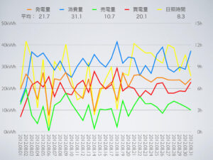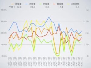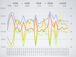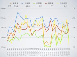 昨年は記録的に日照時間が長かったので、それと比較すると発電量が減っている反面、浴室乾燥機の運転回数が多かったせいか消費量は増えていて、あまり良い成績ではなかったなぁ。