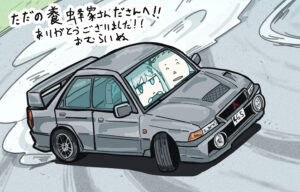 おむらいぬさんのシロコと先生のカーレースネタ、特にWRCネタが大好き過ぎて昔乗っていたシルバーのエボIV(ノーマル)でskebでお願いして描いてもらいました! 最高過ぎる...。